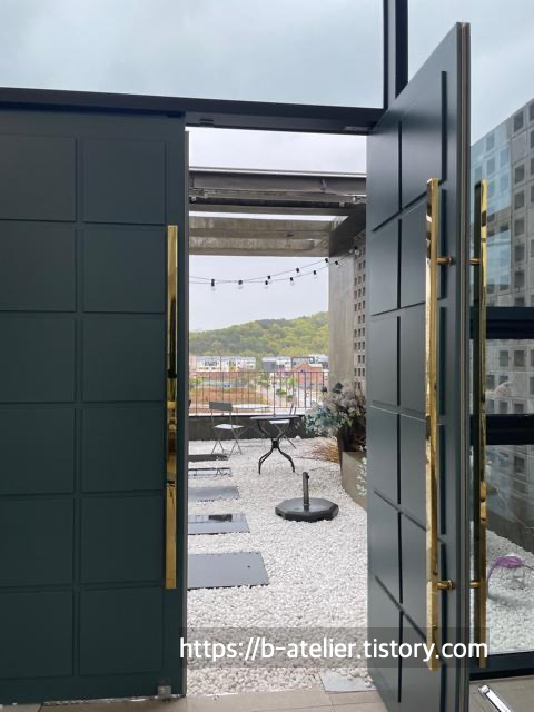 2층에는 테라스도 있었다. 비가와서 나가보지는 못했지만 독특한 색감의 문과 잘 꾸며져 있었다.