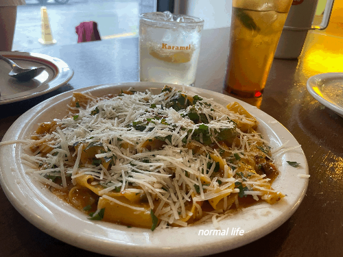 크림소스 하나를 주문했으니 파스타는 라구를 주문헸다. 소고기와 돼지고기가 듬뿍 들어간 라구소스와 생면이 잘 어우러졌다. 눅진한 토마토 라구소스와 넙적한 생면이 너무도 매력 있었다.