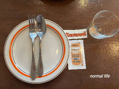 러프한 다이닝이 카라멜의 컨셉이라고 한다. 우드로 톤다운된 내부 인테리어가 편안함을 주고 오렌지 컬러의 소품들과 플레이트로 포인트를 주어 무심한듯 하지만 세련미가 느껴진다.