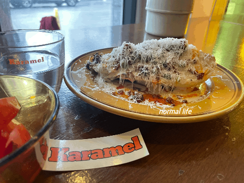 카라멜의 유일한 샐러드 메뉴인 알배추 샐러드이다. 처음 보는 샐러드인데 비주얼이 너무 훌륭했다. 아삭한 알배추와 부드럽고 진한 아이올리 소스와 풍미를 더하는 참기름까지. 구운 알배추인데 아삭아삭 식감이 너무 좋았다. 집에서 따라 할 수 있는 레시피가 아닌 것 같아 이 샐러드가 생각나면 카라멜을 다시 방문해야 할 것 같다.