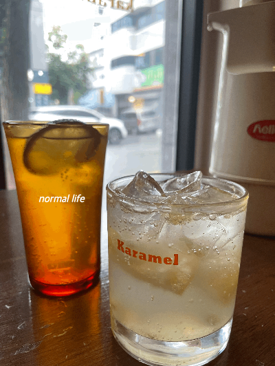우선 음료부터 주문했다. 카라멜의 시그니처 알콜 음료인 라임파인과 논알콜인 레몬 에이드를 주문했다. 시그니처 메뉴답게 테이블마다 라임파인이 하나씩 주문되어 있었다.