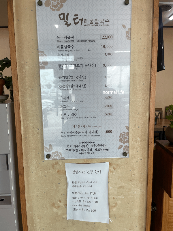 밀터의 대표메뉴인 해물칼국수 1인분 10,000원 1인 1 메뉴시 추가사리는 무료이다. 1인분이지만 낙지, 새우, 조개, 홍합과 미역이 들어간 부드러운 미역칼국수면이 1인분이지만 2명이도 식사 가능한 혜자스러운 양이다. 밀터에서 꼭 맛봐야 할 녹두해물전 22,000원, 왕만두 9,000원 여수막걸리 4,000원 음료 2,000원 주류 5,000원이다.