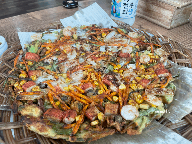 밀터를 방문한다면 해물칼국수와 함께 녹두해물전을 꼭 추천하고 싶다. 새우, 조개, 쭈꾸미 그리고 옥수수와 맛살까지 푸짐하고 바삭바삭한 식감이 훌륭했다. 여수를 방문했으니 지역 막걸리인 여수생막걸리도 주문하여 녹두해물전과 함께 맛보았다.