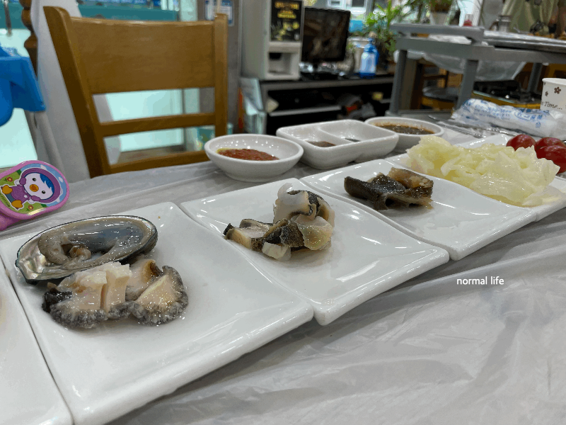 남편과 함께 맛볼 삼치회 소 40,000원을 주문하였는데 상차림을 받아보고 대성식당의 넉넉한 인심에 깜짝 놀랐다. 대하, 전복회, 멍게회, 소라, 문어, 쭈꾸미머리 등 신선한 해산물과 호박잎, 돌김, 갓김치, 완두콩, 옥수수, 양배추, 방울토마토 등 40,000원으로 맛보기엔 놀라운 한상 가득 상차림을 해주셨다. 1대 사장님인 어머님 때부터 푸짐한 상차림을 해오셨기 때문에 현재도 이어오고 있다고 2대 사장님이 설명해 주셨다.