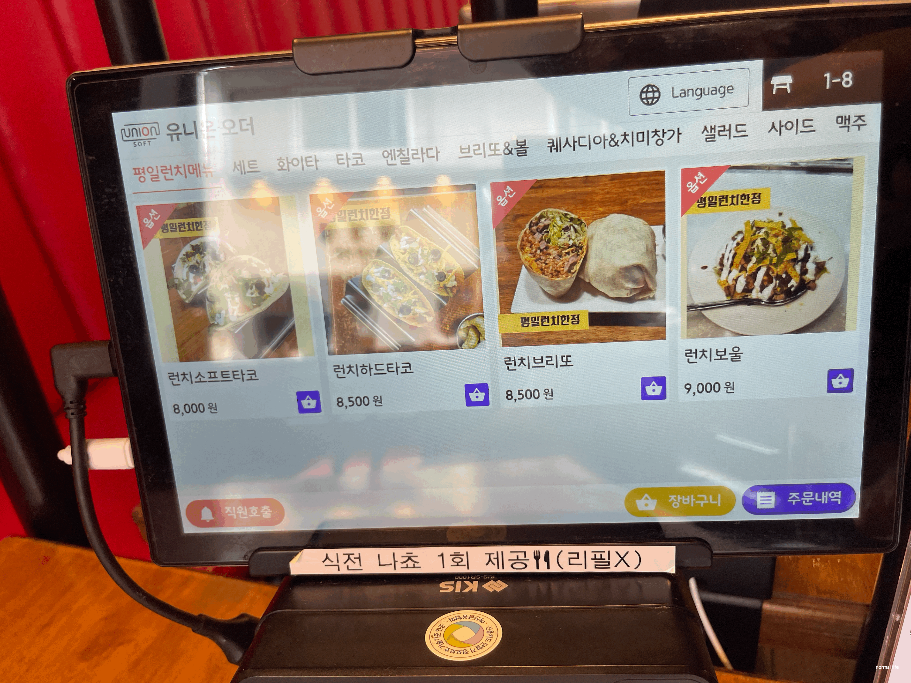 점심시간이 조금 지난 금요일 오후 1시쯤 리코타코를 방문하였는데 외국인 단체손님과 근처 대학생들로 활기찬 분위기였다. 우리는 평일 점심에만 한정으로 주문할 수 있는 평일런치메뉴 3가지와 감자튀김,음료를 추가 주문하였다.