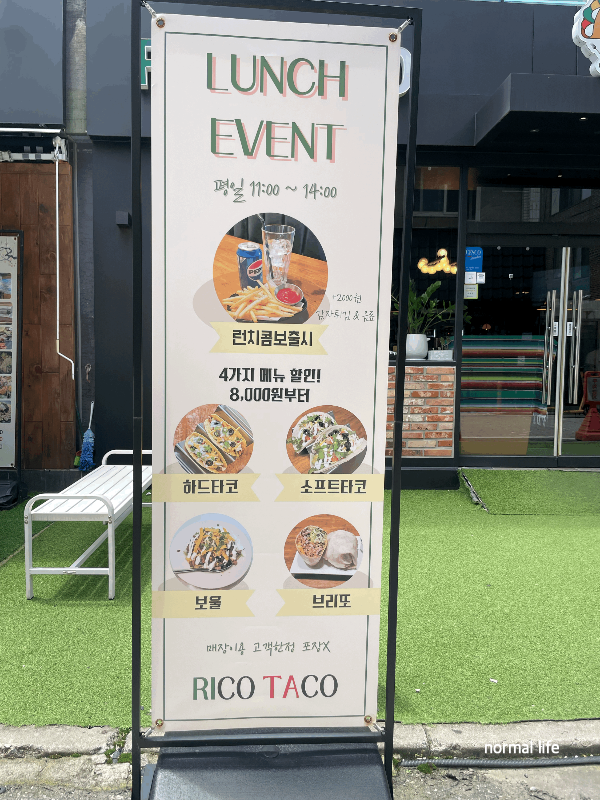 리코타코는 매장 이용고객에 한해 평일 런치한정메뉴를 판매 중이다. 소프트타코 8,000원 하드타코 8,000원 브리또 8,500원 보울 9,000원 4가지 메뉴가 있으며 2,000원 추가 시 감자튀김과 음료를 함께 이용할 수 있다.