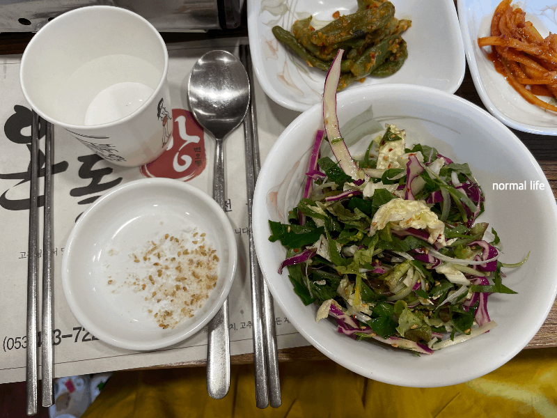 우리는 추석연휴 15일 일요일 오후 5시 30분에 전화예약 후 방문하였고 별채에 8인의 상차림이 준비되어 있었다. 사실 한정식이라기보다는 깔끔하고 가짓수 많은 백반집 같은 느낌의 온돌방식당이다. 맛깔스러운 나물류와 경상도에서만 맛볼 수 있는 콩잎장아찌, 명란젓, 어묵볶음, 두부조림 등 경상도 식당임에도 불구하고 대체적으로 간이 세지 않아 좋았다.