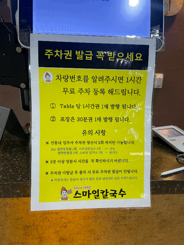 스마일칼국수 선사점은 지하주차장 내에 주차가 가능하다. 식사 시 테이블당 1시간권 1장을 제공하고 포장방문 시에는 30분권 1장을 제공한다.