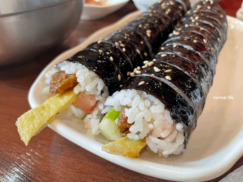 손칼국수와 최고의 조합인 김밥이다. 단무지, 오이, 맛살, 햄, 계란, 유부조림이 들어간 과하지 않지만 든든하고 맛있는 김밥이다. 몇 년 전 스마일칼국수를 방문하였을 때 손칼국수만 맛보았던 적이 있었는데 어린 시절부터 스마일칼국수를 방문했던 대전 친구가 이곳을 방문하면 김밥은 무조건 맛봐야 한다고 했다. 손칼국수만으로도 배불렀지만 김밥이 너무 맛있어서 두줄 다 맛볼 수밖에 없었다. 스마일칼국수를 방문한다면 김밥을 맛보지 않는 사람이 없었으면 좋겠다.