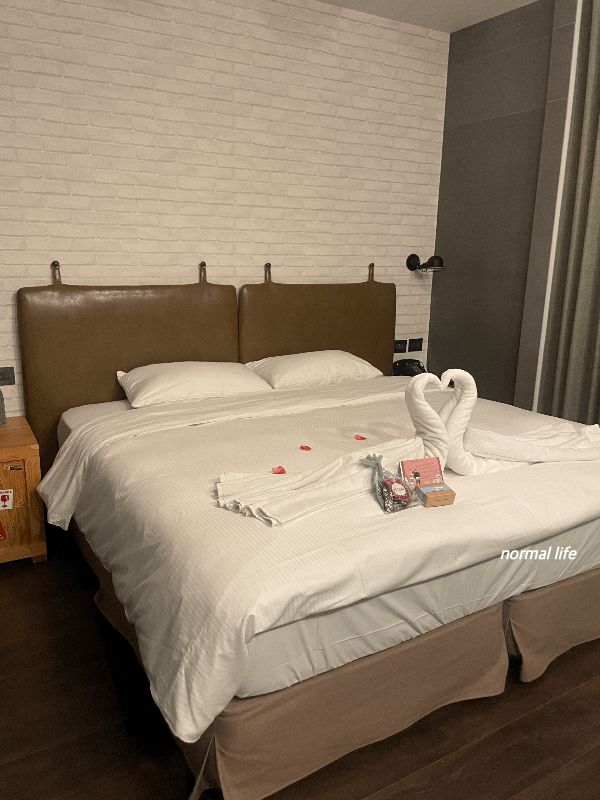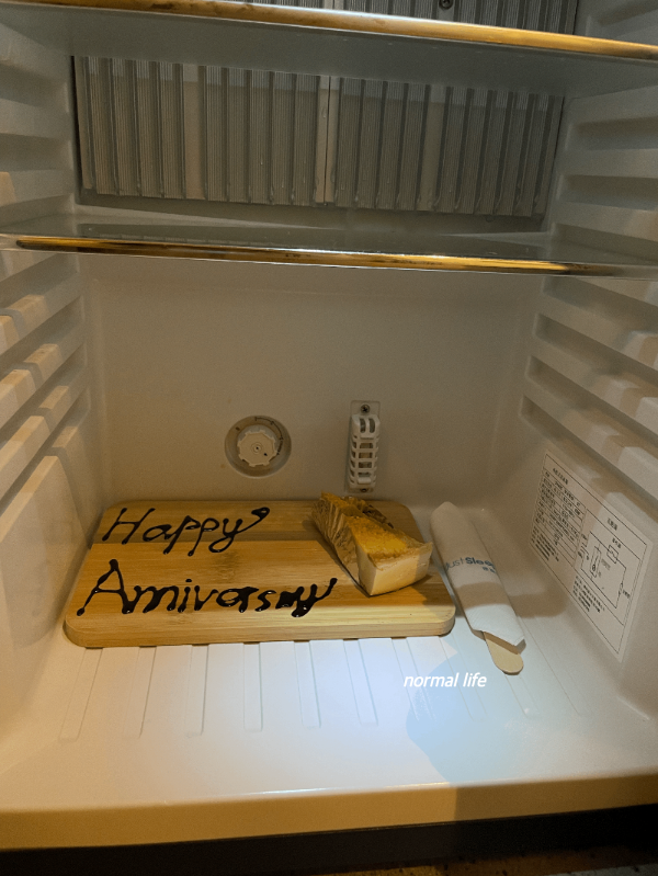 체크인 후 방에 들어왔는데 학과 꽃가루가 침대에 놓여있어 저스트슬립 산충의 분위기와 너무도 어울리지 않는 저건 뭔가 했다. 생각해보니 남편이 결혼 7주년 기념 여행이라고 예약 시 남겨두었던것이 생각났다. 결혼기념일 축하 카드와 비누, 과자, 냉장고에는 치즈케이크까지 준비해준 저스트슬립 산충 직원분들 너무너무 센스 있다.