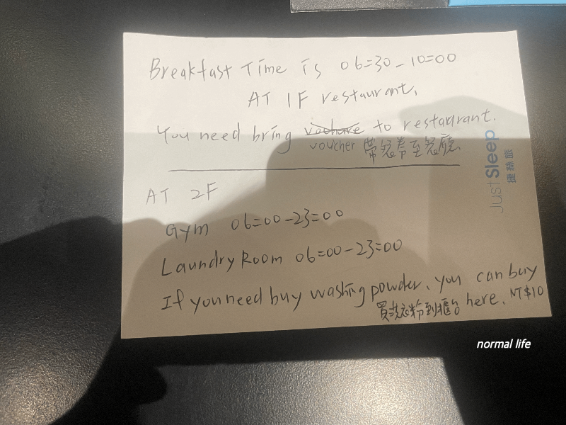 새벽 3시 체크인이라 혹시 로비에 직원이 없으면 어쩌나 걱정이 되어 타이베이 출발 전 미리 메일을 보내두었다. 타오위안 공항에서 새벽 2시에 우버를 타고 새벽 3시쯤 저스트슬립 산충을 도착하니 직원이 우리를 반겨주었다. 무사히 타이베이에 도착하고 체크인을 하니 안도감이 들었다. 체크인 시 매우 젊은 직원이었는데 이것저것 질문을 하니 이렇게 메모를 보여주었다.