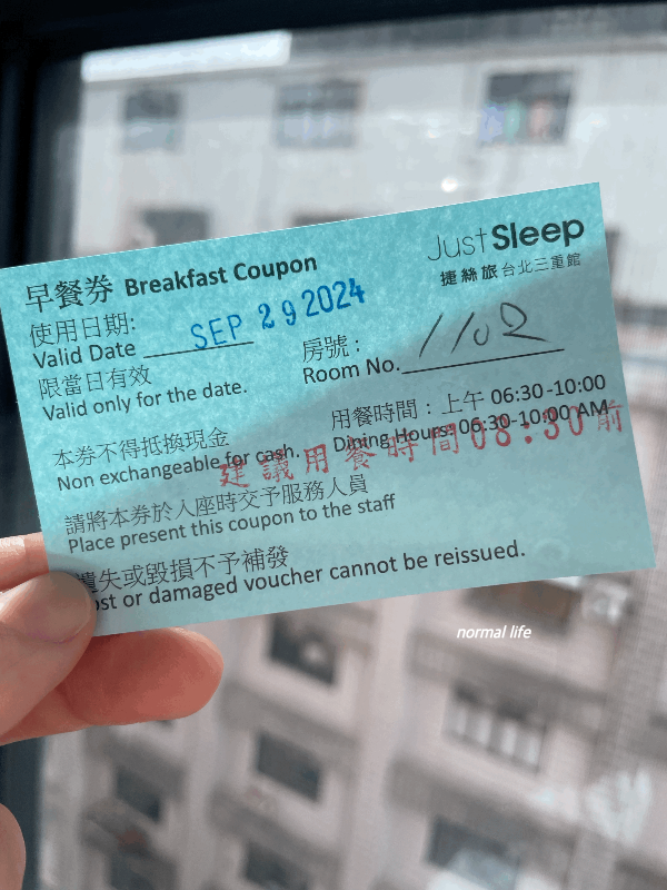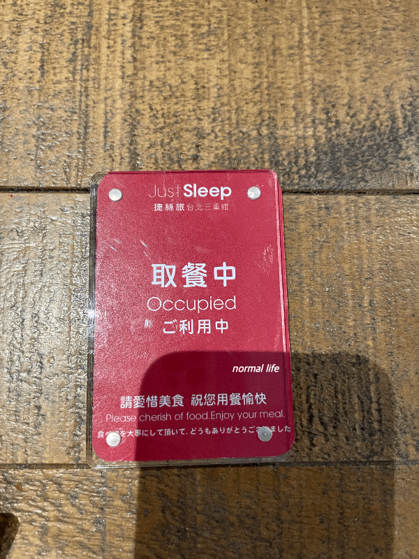 저스트슬립 산충 조식 테이블에는 카드가 한 장 올려져 있는데 파란색 카드는 대만어로 "식사를 완료했다" 빨간색의 카드는 "식사 중"이라는 뜻으로 식사를 시작할 때 직원분이 빨간색 카드로 돌려준다. 중간에 꼬마친구와 카드를 가지고 놀다가 깜빡하고 파란색으로 돌려놨더니 직원분이 오셔서 빨간색 카드로 돌려놔주시며 빨간색으로 놔둬야 식사를 할 수 있다고 알려주셨다.
