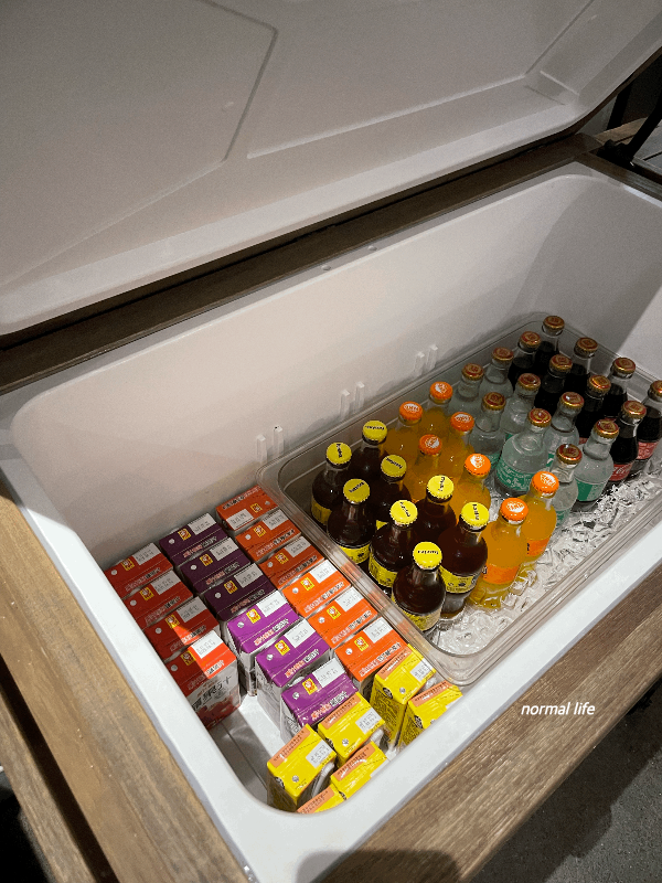 빵 코너 옆에 아이스박스에는 사과주스, 포도주스, 두유, 아이스티, 환타, 사이다, 콜라가 준비되어 있어 마음껏 즐길 수 있었다. 이 음료들은 조식을 먹는 공간에서만 맛보고 룸으로는 가져가지 말라는 주의사항이 적혀 있었다. 음료 디스펜서가 아닌 완제품을 시원한 아이스박스에 꺼내 맛볼 수 있어서 저스트슬립 산충의 호감도가 더더욱 놓아졌다.