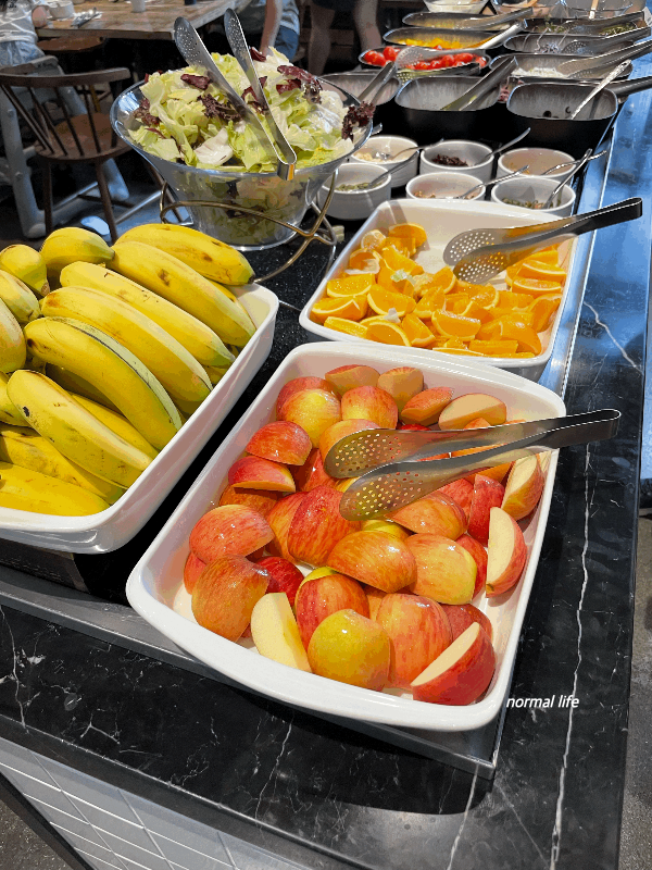 날마다 다른 신선한 과일들 준비되고 음식이 떨어지면 바로바로 채워져서 만족도가 높았던 저스트슬립 산충의 조식이다.