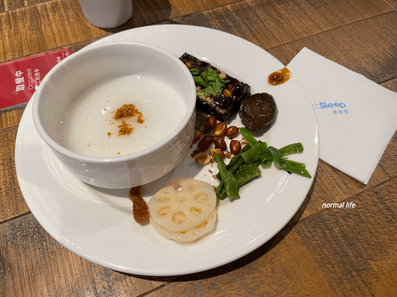 저스트슬립 3일차 나의조식 첫 번째 접시. 고기 가루 올린 흰 죽, 돼지 선지가 들어간 떡 위에 매운 소스와 고수, 궁채나물, 땅콩볶음, 연근샐러드로 시작하였다.