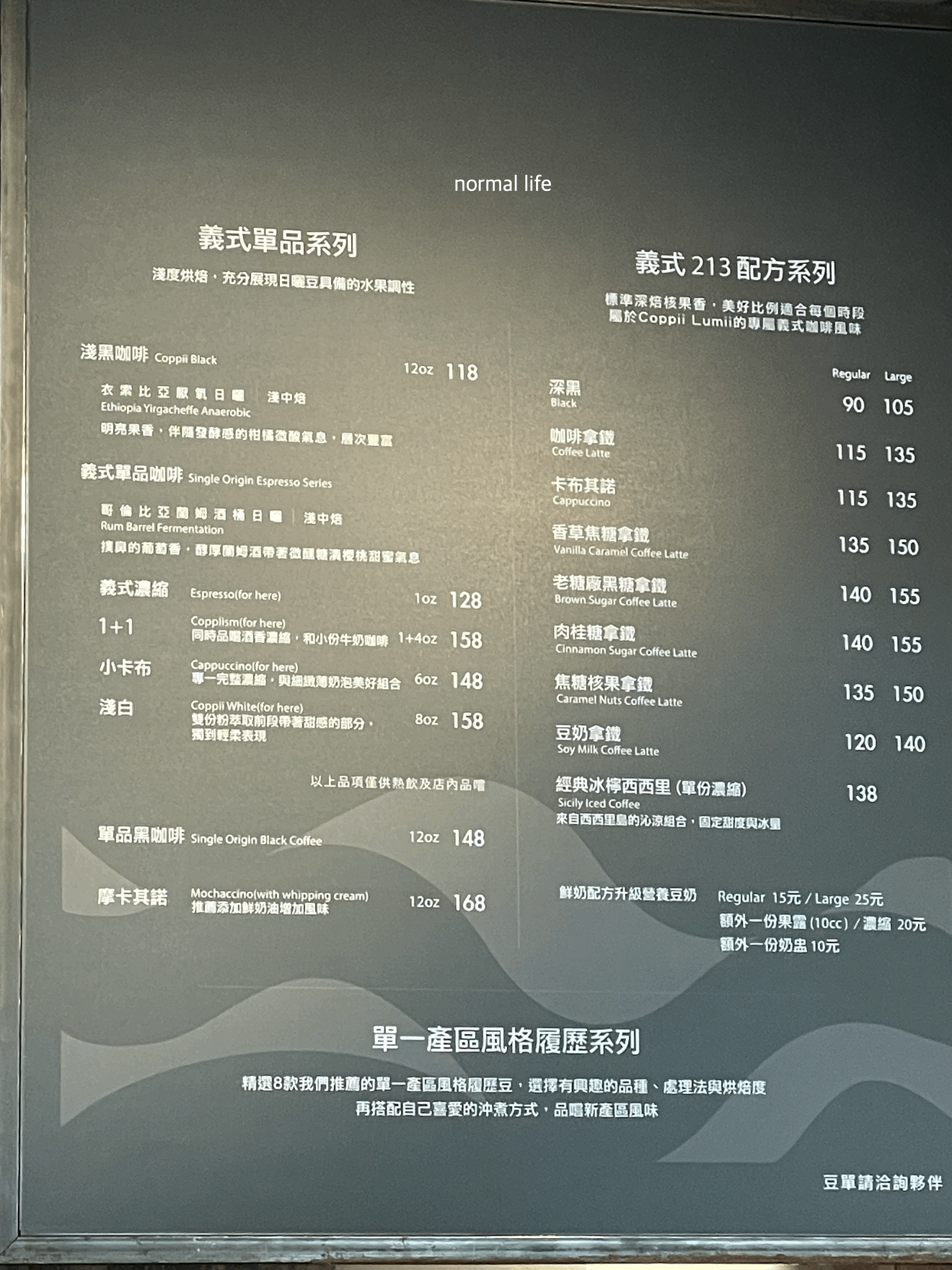 타이베이의 홍대라 불리는 융캉제에 위치한 로스터리 카페 커피루미 리빙커피를 방문해 보았다. 대만에는 85도씨, LOUISA COFFEE, CoCo, 50란 등 다양한 음료 전문점이 있지만 대부분 테이크아웃 전문점이라 매장에서 커피를 마실 수 있는 곳을 찾기는 생각보다 쉽지 않았다. 우리는 웨이팅 후 Coppii Black과 Black 두 잔을 주문하였는데 Coppii Black의 묵직한 바디감과 과일향, 산미의 균형이 어우러져 최근에 맛본 커피 중 가장 맛있는 커피였다. 융캉제를 방문한다면 멋스럽고 세련된 분위기의 커피루미 리빙커피에서 매력적인 커피를 맛보길 추천하고 싶다.