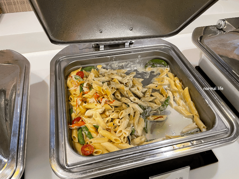 크림파스타, 구운 치킨, 양배추볶음 생선, 볶음밥, 미소된장, 스크램블 등 따듯한 요리가 준비되어 있었다.