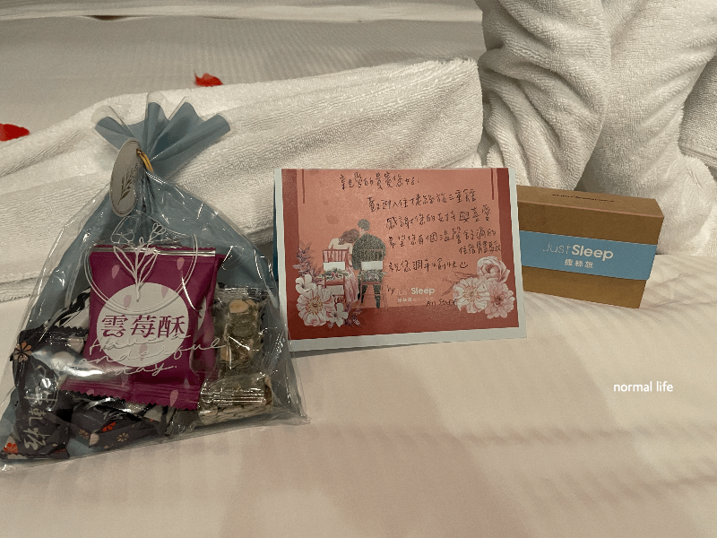 코로나와 출산 육아 후 5년 만의 해외여행이라 남편이 호텔에 결혼 7주년 여행이라는 메모를 해두었다고 한다. 룸에 들어섰는데 저스트슬립 산충의 컨셉과 안 어울리는 로맨틱한 학과 꽃잎이 있어 뭐지? 싶었는데 남편의 이벤트였던 것이다. 호텔 측에서는 카드와 케이크, 비누, 간단한 스낵을 준비해 주셨다.