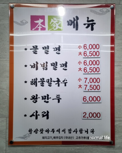 밀면 전문점답게 메뉴도 단출하다. 처음 초량밀면을 방문했을 때에는 5천원대였는데 2023년 7월 현재 밀면은 6천원이다. 서울 평양냉면 가격에 비하면 반값도 안 되는 가격이다. 메뉴판에는 없지만 주문서에 삶은 계란 500원, 수육 한 점 500원으로 밀면 위에 고명을 올릴 수 있다. 천원으로 마트에서 살게 없는 고물가 시대 너무도 착한 가격이다.