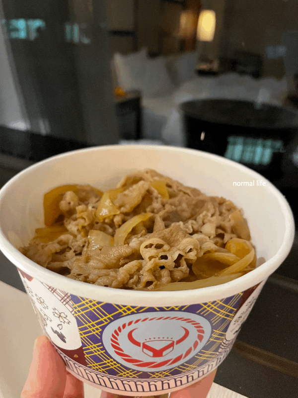 점심으로 훠궈를 많이 먹고 늦게까지 낮잠을 잤던지라 배가 많이 고프지 않아 저녁은 요시노야에서 포장을 해서 호텔 다다미방에서 먹기로 하였다. 많이 늦은 시간인 10시에 방문했음에도 영업 중이었다. 우리는 아이가 좋아하는 소고기 덮밥을 포장했다.
