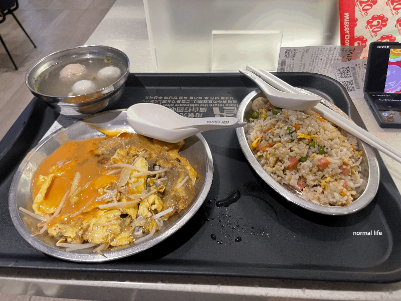 굴전, 어묵탕, 볶음밥 세트도 주문하였다. 각국의 나라 음식을 다양한 음식을 즐길 수 있는 타이베이 101의 푸드코트이다.