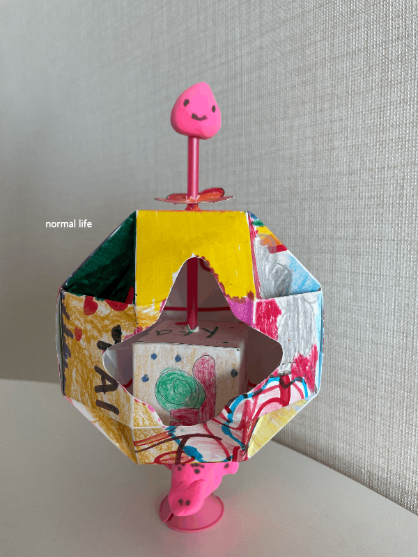 핸드캐리로 소중히 우리 집까지 모셔온 완성품이다. 처음 직원분이 1시간 정도 소요된다고 할 때 설마 했는데 정말 1시간 정도 소요됐다. 첫 번째 작업인 색칠과 그림 그리기는 딸아이와 나 남편 모두 참여하였고, 두 번째 작업인 도안 접기와 붙이기 모양 완성은 남편이, 세 번째 작업 클레이와 풍선대 작업은 딸아이와 남편이 함께하였다. 5세 딸아이가 혼자 하기에는 어려운 것 같아 셋이 함께 체험하니 제법 재밌는 시간이었다.