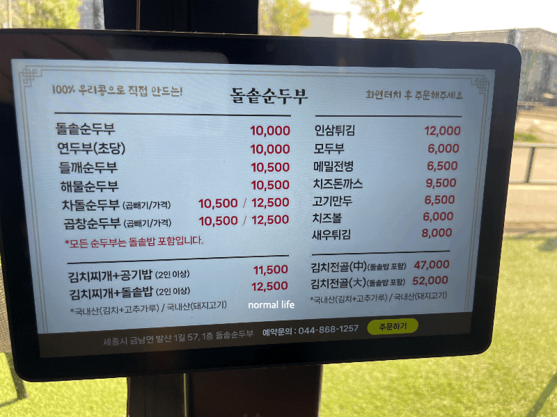 한적한 세종시 금남면에 위치한 돌솥순두부는 내부공간이 넓어 소파석과 테이블석, 단체 모임이 가능한 단체석이 마련되어 있었다. 매일 11시부터 21시까지 영업하는 돌솥순두부는 전화예약도 가능하다.