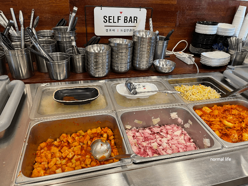 밑반찬 깍두기, 양배추절임, 볶음김치, 콩나무무침이 셀프존에 준비되어 있어 원하는 만큼 리필이 가능하다.