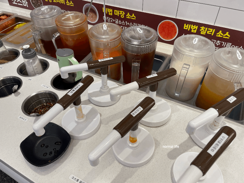 다양한 소스들과 5가지 육수가 소스바에 준비되어 있다. 샤브샤브 육수가 부족할 때에는 리필바에 준비되어 있는 육수를 필요한 만큼 직접 샤브샤브냄비에 추가하면 된다. 샤브샤브와 함께 맛볼 수 있는 스위트칠리, 스리라차, 마장소스, 굴소스와 기호에 따라 추가할 수 있는 고추기름, 피쉬소스, 설탕, 간장, 고추, 다진양파, 다진파, 다진마늘, 와사비가 준비되어 있다.