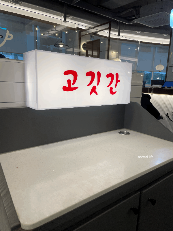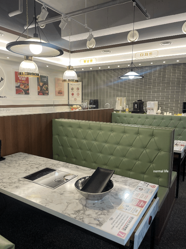 논산 내동 먹자골목 내에 위치한 퐁당은 2023년 오픈하여 매장 안은 깔끔하고 현대적인 분위기였다. 우리는 셀프바와 가까운 위치의 소파 조석에 앉아 편하게 식사를 하였다. 매장이 넓어 단체모임이 가능한 단체석이 있고 예약도 가능하다.