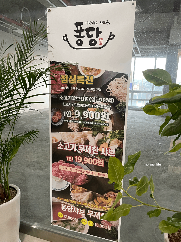 퐁당은 100분의 이용시간 동안 무제한으로 샤브샤브와 월남쌈을 즐길 수 있다. 평일 오전 11시부터 오후 14시까지 점심특선 9,900원으로 소고기샤브전골을 맛볼 수 있다. 무제한 샤브 메뉴는 #편백 샤브 무제한 21,900원 #소고기 무제한 샤브 19,900원 #퐁당 샤브 무제한 소고기 80g 12,900원 #퐁당 샤브 무제한 소고기 100g 15,900원이다.