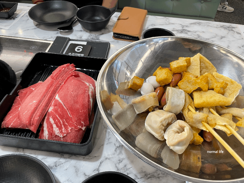소고기샤브 무제한을 주문하면 육수와 샤브재료를 직접 담아 먹을 수 있는 볼, 그리고 소고기를 테이블로 가져다준다. 첫 번째 소고기를 맛보고 난 후 리필 소고기는 리필바 옆에 있는 고깃간에 빈 고기접시와 번호표를 가져다 놓으면 확인 후 직원이 직접 테이블로 소고기를 가져다주는 시스템이다.