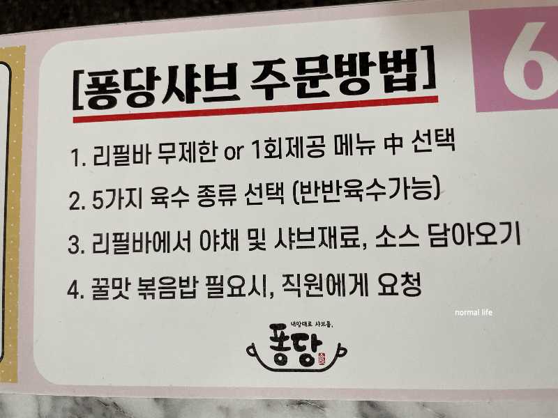 처음 방문해 본 퐁당이라 직원분께서 친절히 퐁당의 이용방법을 설명해 주셨다. 1. 단품메뉴 또는 무제한 샤브메뉴를 주문한다. 2. 얼큰한 한국식 마늘육수, 구수한 한국식 사골육수, 얼얼한 중국식 마라육수, 단짠단짠 일본식 간장육수, 감칠맛 나는 베트남식 쌀국수육수 중 선택한다. 반반 육수 선택 시 2,000원 추가된다. 3. 리필바에서 샤브 재료, 월남쌈, 소스를 취향껏 담아 온다. 4. K-디저트 볶음밥은 직원에서 요청한다.