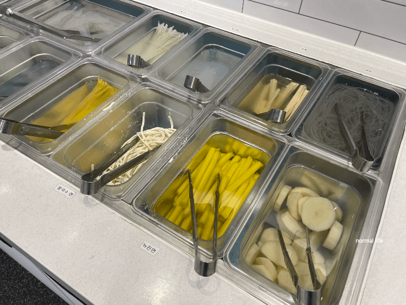 마라탕가게에서 볼법한 재료들도 보였다. 감자, 뉴진면, 푸주, 옥수수면, 중국당면, 분모자, 길당면이 있어 얼얼한 중국식 마라육수에 퐁당 넣어 맛보면 좋은 샤브재료들이다. 이밖에도 떡볶이떡, 조랭이떡, 메추리알, 칼국수면이 있었다.