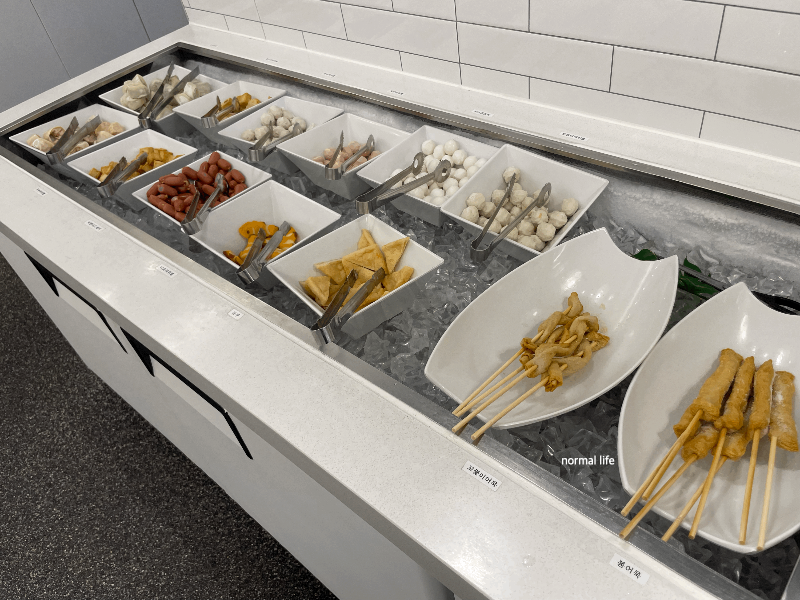 꼬치어묵, 유부, 니모피쉬볼, 비엔나소시지, 두부튀김, 고기만두, 김치만두, 새우피쉬볼, 치즈옹심이, 오징어피쉬볼 등 다양한 재료들이 준비되어 있어 취향껏 가져다 맛볼 수 있었다.