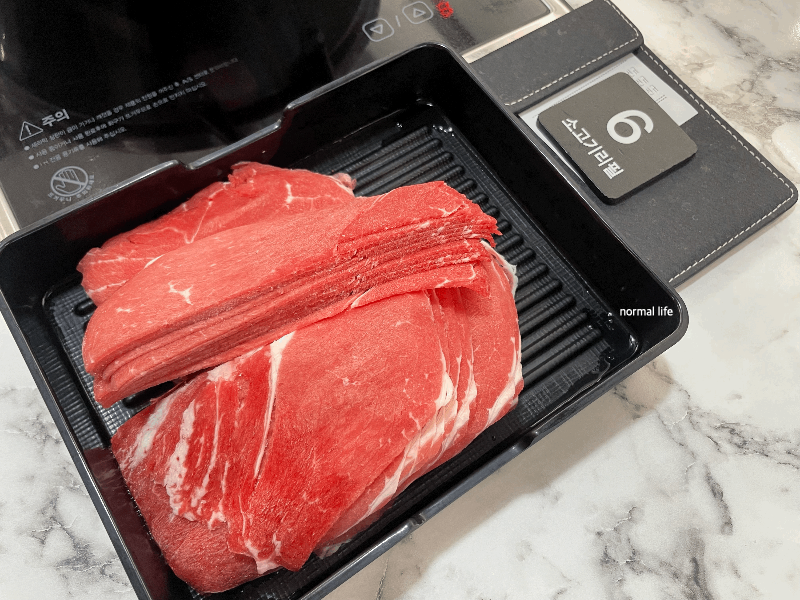 우리는 편백샤브 무제한과 소고기샤브 무제한 중 고민하다 소고기샤브무제한 19,900원 성인 4인과 유아 1인 5,000원을 주문하였다. 편백샤브 무제한은 편백찜 1회 제공 소고기, 샤브샤브, 월남쌈은 무제한으로 즐길 수 있다고 한다. 소고기는 처음에 직원이 직접 테이블로 가져다주고 이후부터는 고깃간에 고기접시와 테이블 번호를 함께 놓으면 직원이 확인 후 테이블로 소고기를 가져다준다.