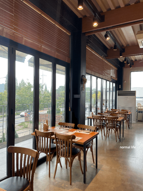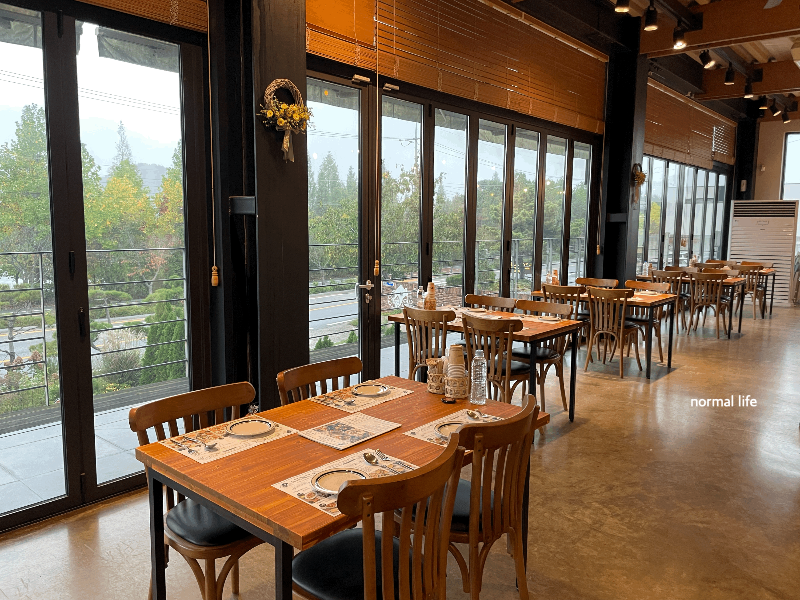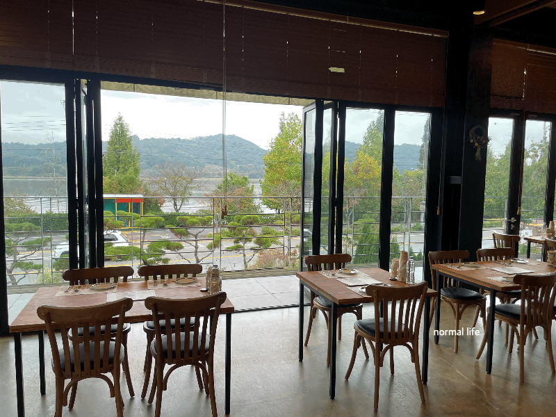 주차장에 주차 후 입장하는 곳이 올드밀 2층인데 폴딩도어 너머로 신정호의 시원한 뷰를 감상할 수 있었다. 선선한 계절 11월에 방문하여 폴딩도어 너머로 상쾌한 공기가 들어와 가을을 즐기며 식사할 수 있었다.