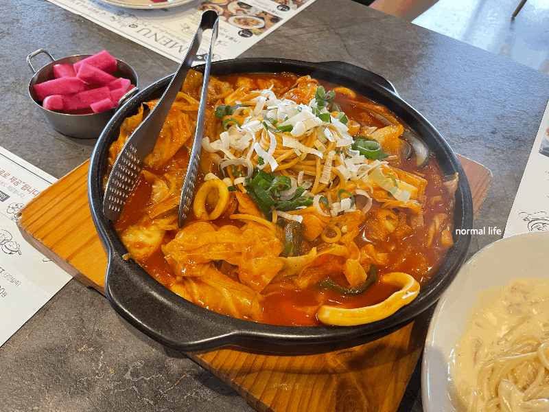 매콤한 맛을 좋아하는 어른을 위한 상하이파스타도 주문하였다. 국물이 자작한 돌솥 짬뽕 비주얼이었으며 파스타면과 얼큰한 짬뽕 소스가 매력적인 파스타이다.