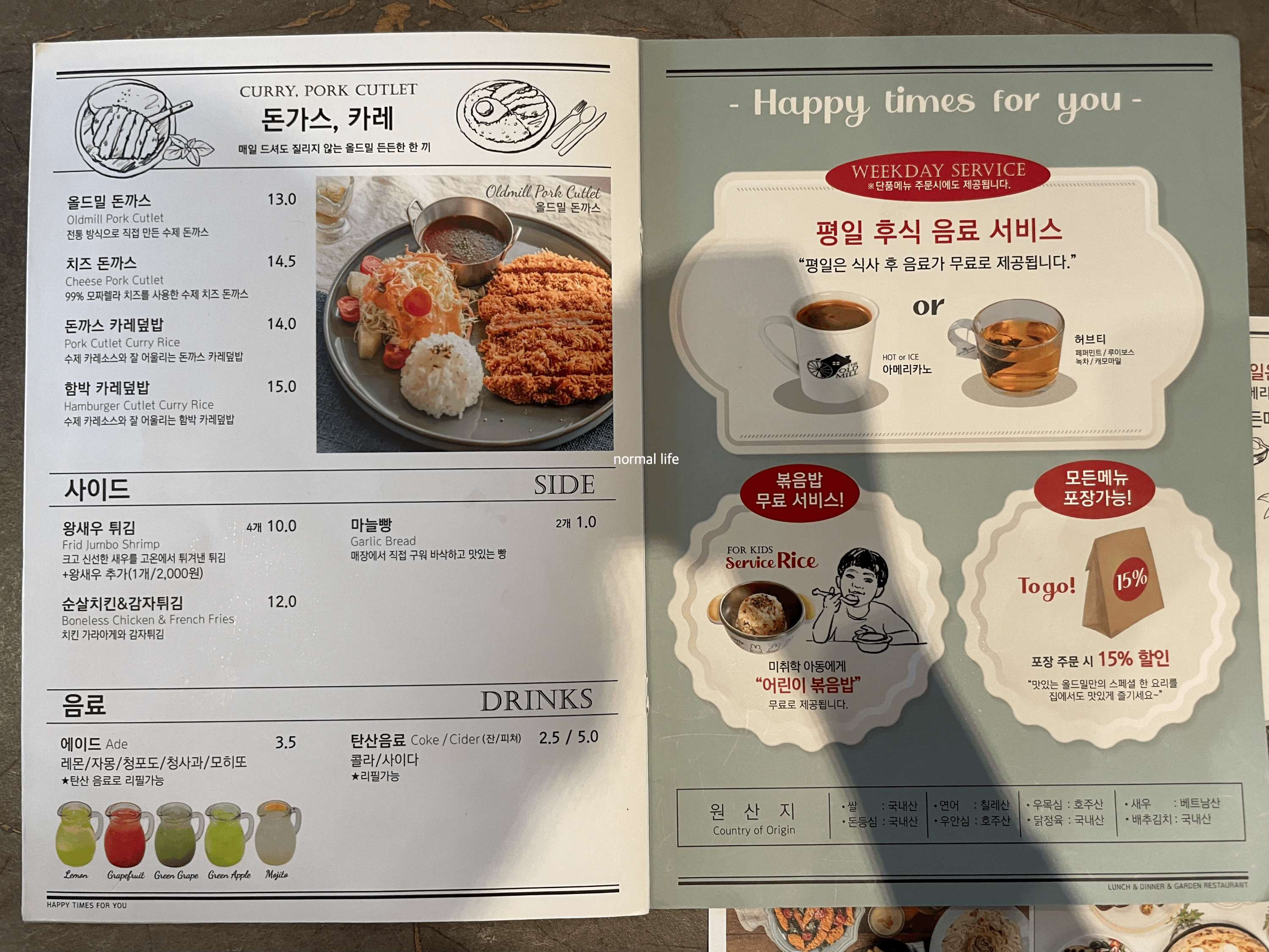 우리는 아산타워와 장영실 박물관 관람 후 2시 50분쯤 올드밀을 방문하였다. 오후 3시부터 브레이크타임이라 올드밀에 사전에 전화 후 3시 전까지 주문을 받아주신다 하여 방문하였다. 성인 4명, 5세 아이 2명이 함께하는 늦은 점심 식사였다. 세트메뉴와 단품 메뉴를 고민하다 가격차이가 많이 나지 않는 것 같아 맛보고 싶은 것 위주로 주문하였다.