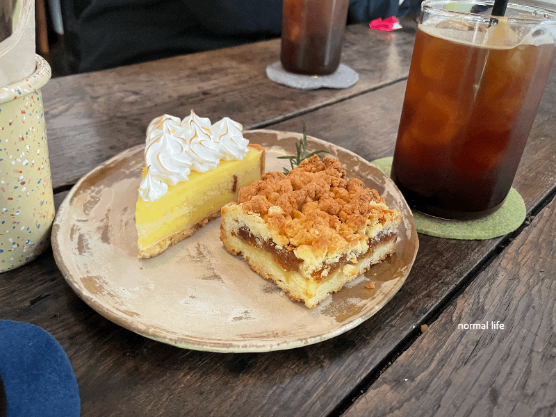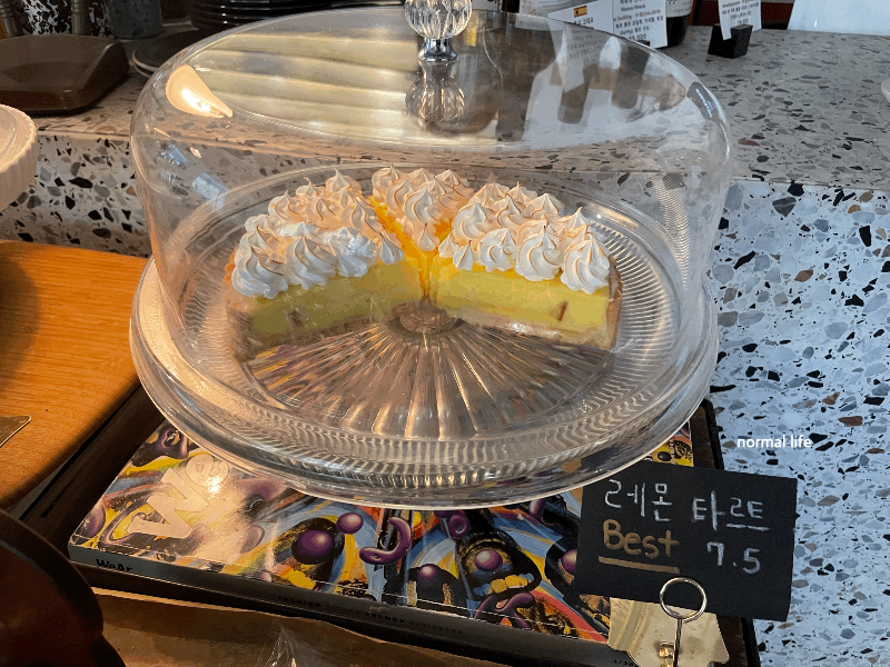 핀카페의 베이커리 베스트 메뉴는 #레몬타르트 7,500원 #바스크 치즈케이크 7,500 #애플크럼블 5,800원이다. 납품받는 정형화된 케이크 같지 않고 하나같이 독특하고 먹음직스러워 보였다.