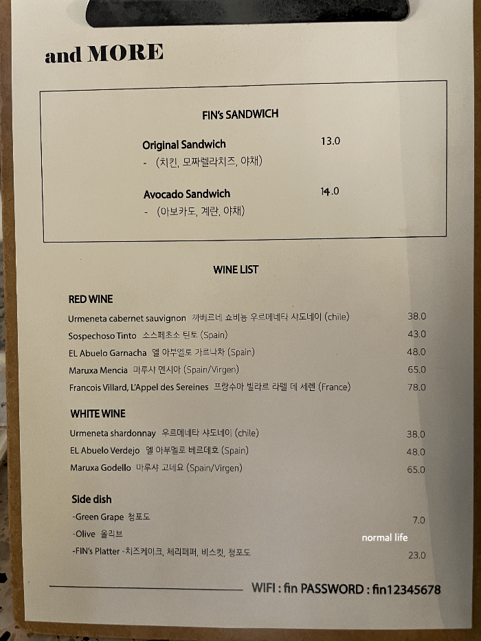 예전에는 핀카페에서 브런치 메뉴를 즐길 수 있었는데 현재는 운영하고 있지 않다고 한다. 유럽감성의 핀카페에서 브런치를 즐길 수 없다니 조금 아쉽다. 대신 오후 4시까지 두 종류의 샌드위치를 판매하고 있다고 한다. 프랑스인들이 많은 서래마을이다 보니 레드와인과 화이트와인, 그리고 와인과 함께 즐길 수 있는 사이드메뉴도 준비되어 있다.