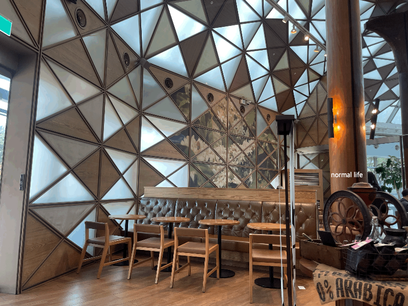 직물과 나무톤으로 벽부터 천정까지 이어져 커피나무 숲 아래에 있는 느낌을 받을 수 있도록 설계했다고 한다. 곡선과 햇빛 그리고 나무톤으로 자연친화적이면서 따뜻한 느낌이 가득했다.