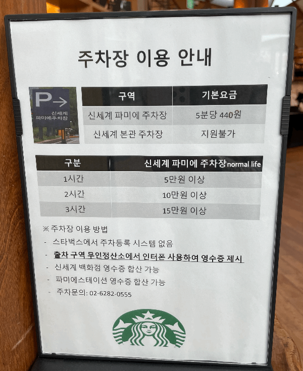 스타벅스 파미에파크 R점은 신세계백화점 강남점과 파미에스테이션 영수증 합산이 가능하다. 신세계 본관 주차장은 지원이 안되며 신세계 파미에 주차장을 이용하여야 주차지원이 되니 주의해야 한다.