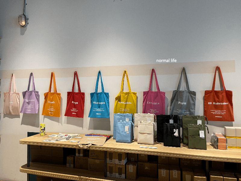 커피의 원산지가 적힌 컬러풀한 에코백 7,500원과 보냉백 L 19,000원이다.