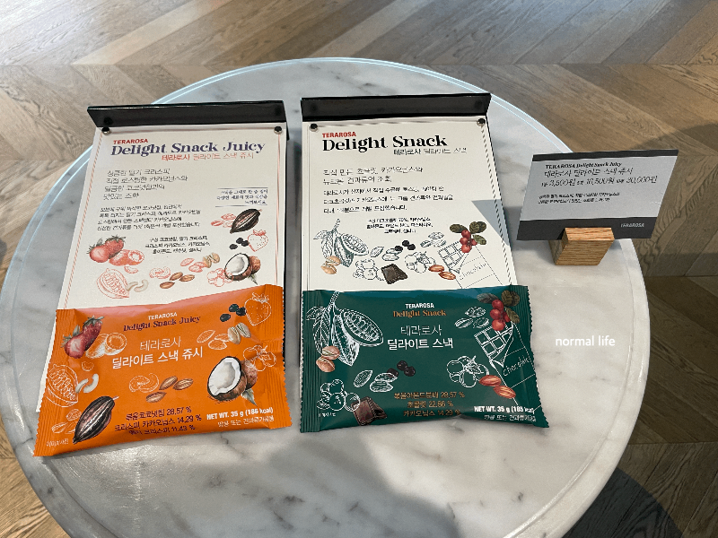 상큼한 딸기 크리스피, 카카오닙스, 코코넛칩이 들어있는 테라로사 딜라이트 스낵 슈지 1봉 3,500원 5봉 16,500원 10봉 30,000원이다.