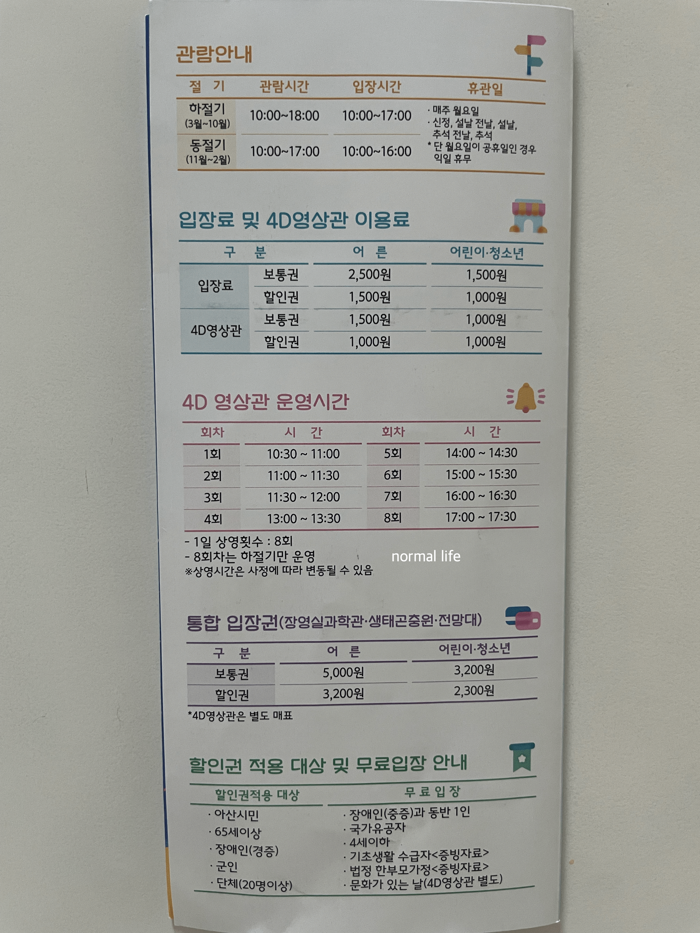 장영실 과학관은 아산 생태곤충원, 그린타워 전망대와 함께 아산환경과학공원에 위치하고 있어 아산을 방문하였다면 통합입장권을 구매하여 세 곳을 함께 방문하는 것을 추천하고 싶다. 통합권은 성인 5,000원 어린이와 청소년은 3,200원으로 가격 대비 훌륭하였다.