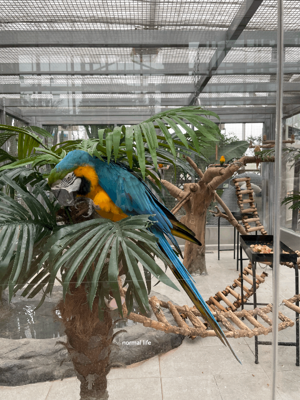 앵무새 마을에는 국제적 멸종위기종인 회색앵무, 청금강, 썬코뉴어, 시나몬코뉴어가 함께 전시되어 있다.