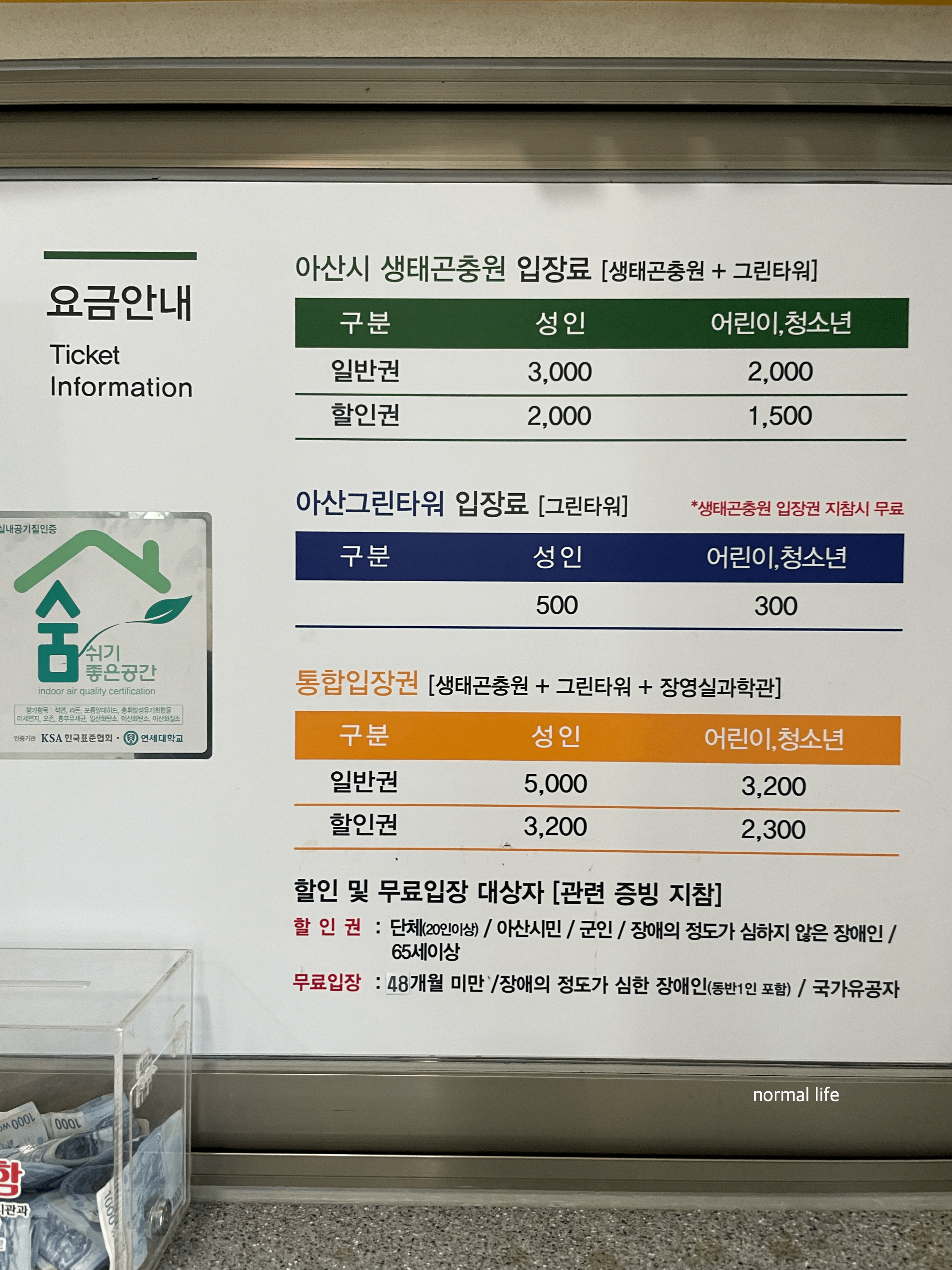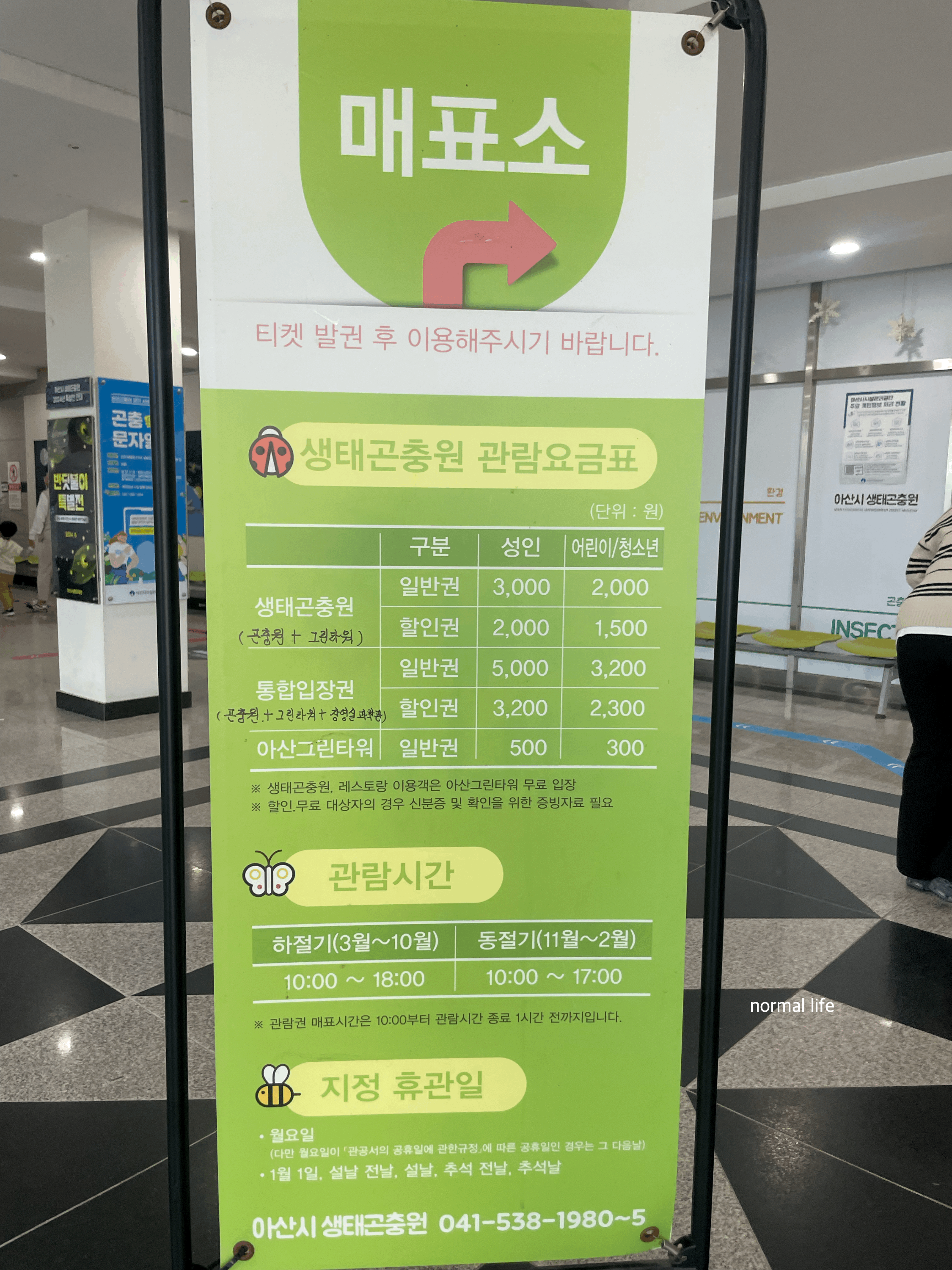 아산 환경과학공원 내에 함께 모여있는 아산그린타워, 장영실과학관, 생태곤충원을 모두 입장할 수 있는 통합권도 있는데 성인 5,000원 어린이 3,200원으로 전망대와 과학체험, 생태체험까지 다양하고 알차게 즐길 수 있어 생태곤충원을 처음 방문했다면 꼭 통합권을 구입해 3가지를 함께 즐기기를 꼭 추천하고 싶다.