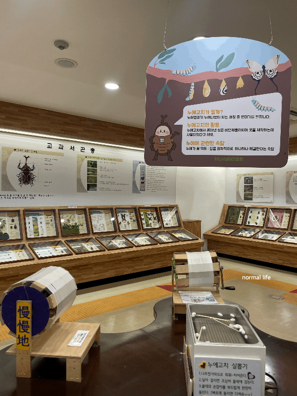 다양한 곤충들이 박제되어 있는 곤충학습실에는 누에고치 실 뽑기를 체험해 볼 수 있다.