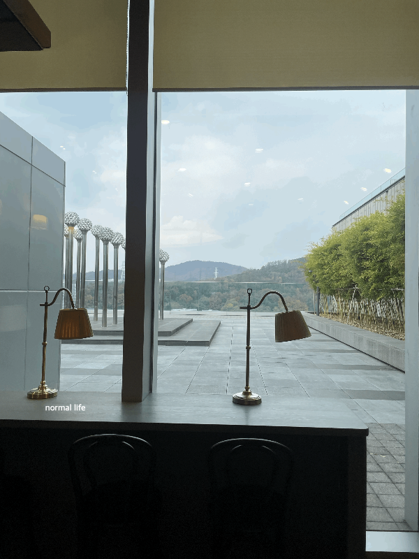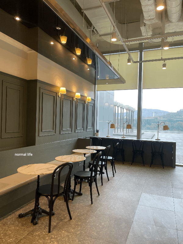 단풍 진 가을 산과 대전신세계 마운틴 테라스를 함께 즐길 수 있는 내부에 자리가 없다면 카페스테이인터뷰 외부에도 좌석이 마련되어 있다. 층고가 높은 대전신세계 7층 통로에 마블 테이블과 라탄 의자라 마련되어 있어 조금 더 편안하게 대화를 할 수 있었다.